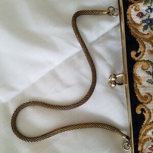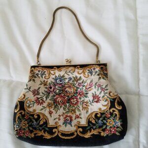 Lovely floral tapestry fabric trimmed with gold (brass) opening. Fully lined inside with one small pocket. Great condition