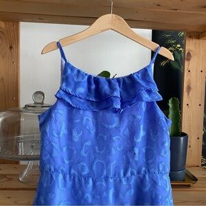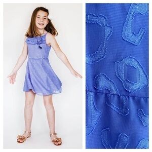 Gorgeous girls Florence Eiseman Periwinkle Purple Animal Print Appliqué Ruffle Chiffon Dress. We loved this monotone animal print chiffon and designed this dress with a swingy skirt and yoke ruffles. A dress that both mom and kid will approve of - at last! Periwinkle animal print chiffon - Back Zipper - 100% polyester - Double ruffle - Spaghetti straps