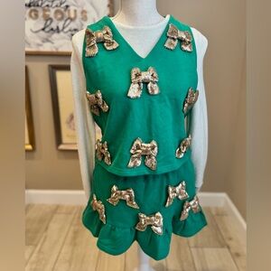 Turn heads in this brand-new Queen of Sparkles two-piece set, featuring a matching green sleeveless top and skort covered in gold sequin bow embellishments! This set is playful, sparkly, and perfect for holidays, parties, or adding extra cheer to your everyday style.