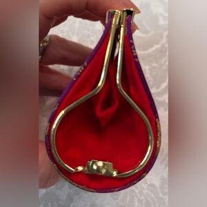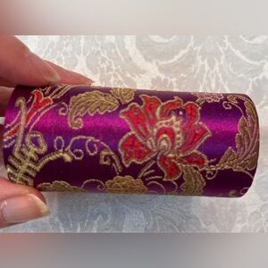 Vintage satin purple brocade case with kiss lock closure is perfect for holding your lipstick or other small essentials in style. Compact size 3.5” x 2.5” x 1.5”. Fully lined. Excellent condition.