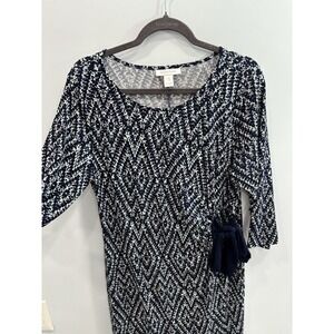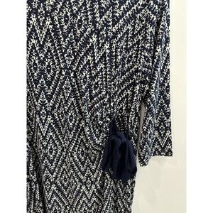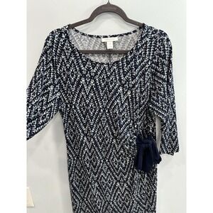 Comfort meets style in this Motherhood Maternity dress, designed to flatter through every stage. This navy and white printed dress features a soft, stretchy fabric blend with a feminine scoop neckline and 3/4 sleeves.