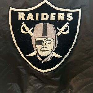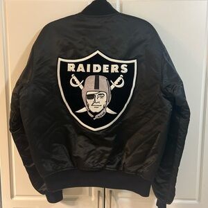 Classic black satin bomber with Raiders logo. Features ribbed cuffs and collar. Ideal for fans and casual wear.