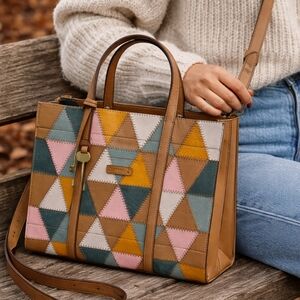 This bag is a statement Fossil piece. The leather patchwork geometric design in soft neutrals + muted pastels gives it that artisan / boutique vibe while still being totally wearable. Structured shape makes it polished enough for work but fun enough for everyday.
