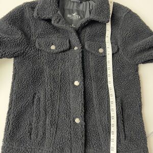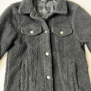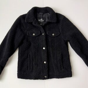 Chic black teddy Sherpa women’s jacket by Hollister. Soft texture and button-up style. Chest pockets. Ideal for layering. Great for winter warmth and style. Size medium