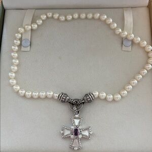 Judith Ripka hallmarked faux pearl necklace with sterling silver CZ embellished magnetic removable fitting for interchangeable area for pendants. Includes a beautiful sterling silver Maltese cross featuring 8 CZ’s, bezel set oval faceted amethyst, 4 bezel set mother of pearl accents with a rope design. It will be shipped in the original Judith Ripka presentation box. See photos for details. Stunning design and look in preowned gently used condition