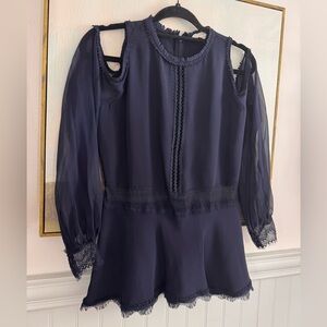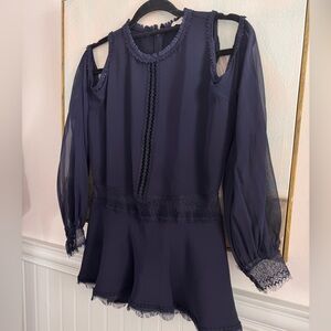 A blue cold shoulder lace trim blouse by Jonathan Simkhai that features sheer long sleeves, lace cuff detailing, and a back zip. This flowy top gives off a romantic vibe and is the perfect casual staple that you can easily match with a good pair of jeans.