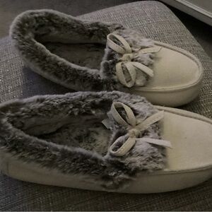 These slippers feature a cozy cream exterior with a plush gray lining, offering warmth and comfort for indoor wear. The moccasin-style design with a rounded toe and decorative bow adds a touch of elegance to your lounging experience. Perfect for relaxing at home, these slippers effortlessly blend style and comfort.
