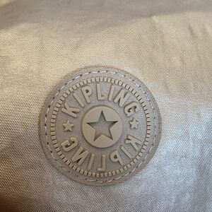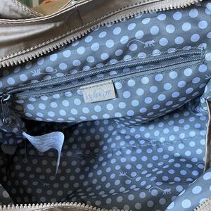 Chic Kipling baby bag in tan. Features playful polka dot interior. Ideal for stylish moms.