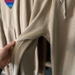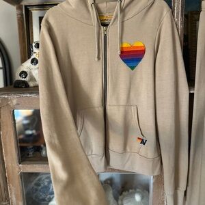 Tan hoodie and joggers with colorful rainbow heart patches. Perfect for casual style. Excellent condition. Pants have never been worn. Zip up worn twice. No piling or damage. Like new. Could be willing to spilt.