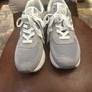 Elevate your look with these stylish New Balance sneakers. Perfect blend of gray and white for a modern touch.