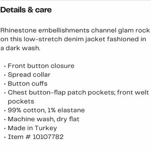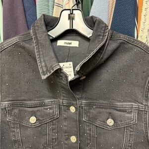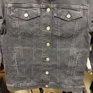 Mavi jeans Karla rhinestone denim jacket in size small, NWT. Color is called “shiny smoke denim.” The stock photos best represent the true color, my closet lighting makes it appear a bit lighter than it is.