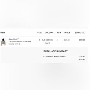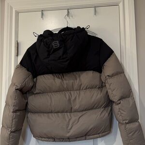 Super World- The super puff shorty puffer jacket in black and taupe. Womens size small. In really good condition. Thumbhole wrist sleeves (some signs of wear). Detachable hood. Zipper and button closure. Originally bought from Aritzia.