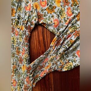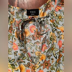 Stunning VICI Floral dress with long sleeves (balloon style) and gorgeous floral print! Love the smocked bodice, so comfy and stretchy! Top features V neckline with ties!