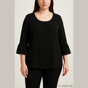 Chic black blouse with a round neckline. Features stylish three-quarter sleeves. Ideal for versatile styling.