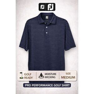 footjoy golf polo, mens performance golf shirt, navy pinstripe polo, athletic fit golf top, moisture wicking polo, golf course style, country club aesthetic, classic mens golfwear, polished athletic wear, golf essentials, business casual polo, footjoy mens medium, titleist golf shirt, peter millar polo, nike golf polo, adidas golf shirt, callaway mens polo, under armour golf, travis mathew polo