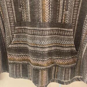 Stylish V-neck sweater with geometric patterns. Features brown,gray and pink tones. Light weight with hoodie.