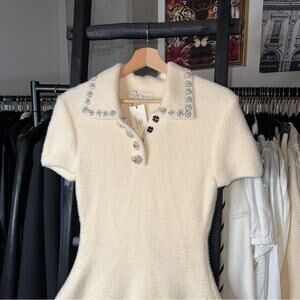 This elegant ivory mini dress combines timeless sophistication with a playful modern twist. Designed in a soft wool-viscose knit, it features a polished polo-style collar adorned with silver crystal floral embellishments and matching jeweled buttons. The short sleeves and flared skirt create a flattering A-line silhouette that moves beautifully with every step. Perfect for evening outings, chic events, or elevated everyday wear, this dress balances comfort and glamour effortlessly.