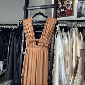 Ronny Kobo Charlie Dress Driftwood Brown Ruched Cutout Jersey Maxi