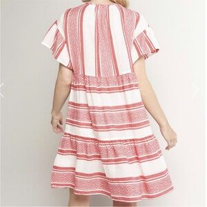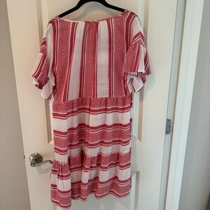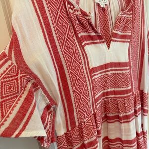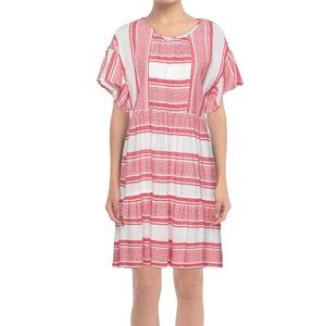 Velvet by Graham & Spencer Janaye Island Jacquard Ruffle Red & White Dress, size small. Striped design, ruffle sleeves and bottom, flowy fit. In great condition! 100% cotton. crafted from a soft cotton jacquard, this frock has a breezy silhouette, with a seam at the bust that flares out to a subtle frilled skirt. the sleeves are also ruffled and there is a single button closure at the neckline. just add sandals!