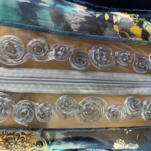 This lightweight and airy Serenade New York jacket is a true piece of art. Featuring a beautiful blue and green mesh paisley print accented by velvet lettering, this jacket also boasts exquisite floral beadwork on the front. The reverse weave seams give it a deconstructed feel, while the lace trim adds a feminine touch. Entirely sheer, it is perfect for layering and ideal for adding an artistic flair to any outfit. Size Large for a comfortable fit.