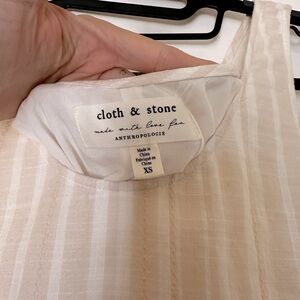 Effortlessly chic and breathable, this Cloth & Stone tank dress is crafted from a lightweight linen-blend fabric in a subtle white and cream stripe. Features a relaxed, straight silhouette with a flattering scoop neckline and a feminine bow tie detail at the back. Perfect for beach days, summer outings, or layering with a denim jacket for an easy everyday look. Size XS – fits true to size. Excellent condition with no flaws.