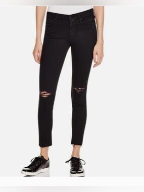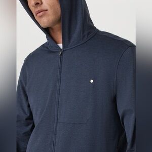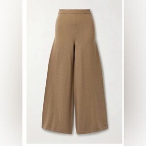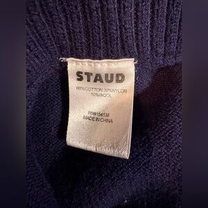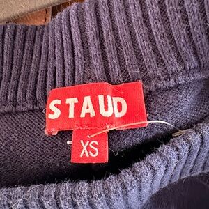 These Staud pants are in a sweater-like material, 60% cotton, 10% wool, in a size XS. They are in navy blue, sold out in stores, and retail for $229. 28” inseam