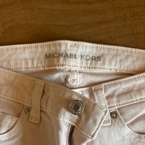 Michael Kors Izzy Cropped Skinny ankle jeans in a soft light pink/cream shade. Slim, flattering fit with stretch for comfortable everyday wear. Easy to dress up or wear casually—perfect for spring and summer.