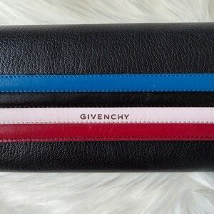 Chic Givenchy wallet in black. Features bold blue, pink, and red stripes. Sleek and fashionable.