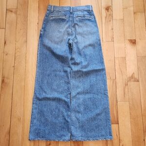 Pleated front jeans with zippered fly, button closure, and belt loops. Two front slash pockets and two back pockets. Wide leg silhouette with clean hems. Intentional distressing throughout.