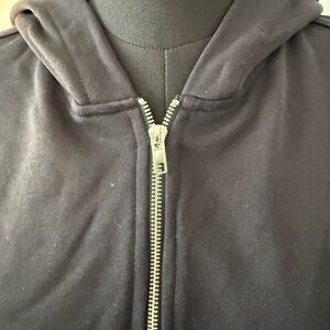 black cropped zipper hoodie. Features a front zipper and unique cut. Ideal for casual wear.