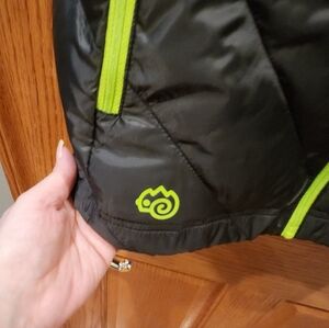 Stay warm and stylish with this sleek black puffer vest featuring vibrant green accents. Perfect for layering in cooler weather.