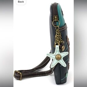 Chala crossbody bag with turtle design. Features teal and black colors. Includes starfish charm. Perfect for casual outings.