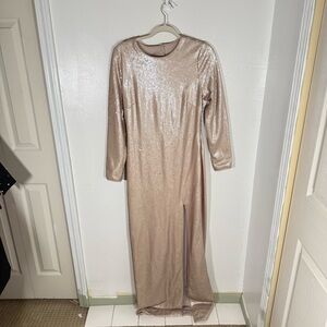 Color & Detail: Buff & gold; long sleeves; round neckline; allover sequins; side slit; open back cutout with hook closure; hidden side zipper; slight train.