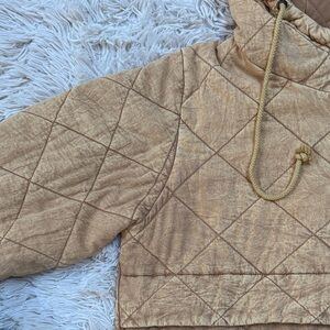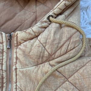 And The Why Quilted Hooded Quarter Zip Jacket in Mustard Tan. Features adjustable drawstring hood, pockets and button cuffs. Perfect for layering.