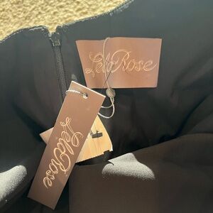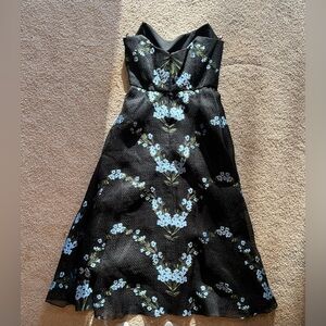 Elegant black dress with blue floral patterns. Sleeveless design. Perfect for formal occasions.
