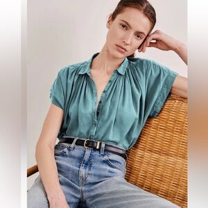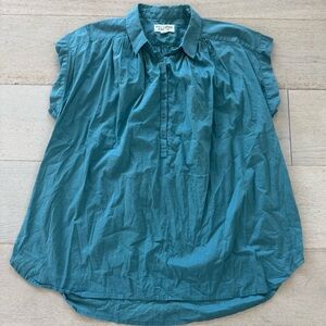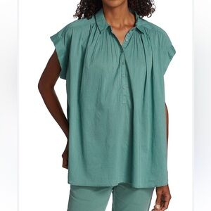Oversized, voluminous pullover blouse. Dropped shoulder. Center front half button down with troka buttons. Shirring throughout front and back. Small collar. Shirttail hem. Hanger loop detail at back. Easily able to tuck in.