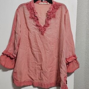 The top is a women's pink embroidered ruffle v-neck blouse, possibly from Soft Surroundings. It features a crinkle or gauze texture, elaborate ruffle and embroidery detailing around the v-neck, and 3/4-length ruffled bell sleeves. The color appears to be a salmon or blush pink, with a slightly faded or acid-washed look.