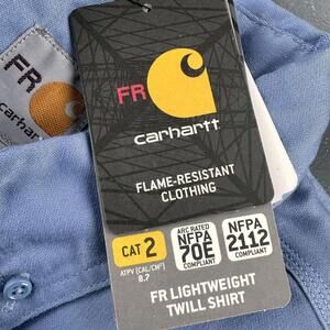 Carhartt FR Lightweight Twill Shirt in men's size Large. This flame-resistant shirt is made from a durable blend of 88% cotton and 12% nylon, providing comfort and protection. It features a classic blue color with button closures and dual chest pockets, including one with the Carhartt logo patch. Designed for safety and compliance, this shirt meets NFPA 70E and NFPA 2112 standards, making it ideal for industrial work environments requiring flame-resistant clothing.