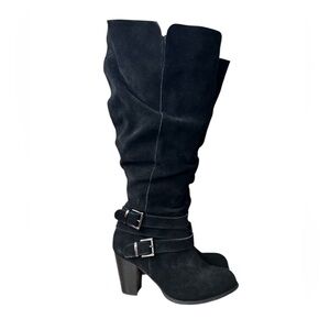 Torrid like new black slouchy suede wide calf boots with 3.5” heel. Silver side buckle detail.these boots are quality made and clean with no signs of wear.