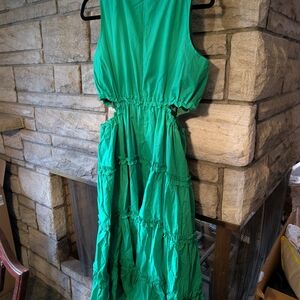 A solid midi with a rounded neckline, side cutouts, and a back zipper closure. Ruffles included along the neckline, cutout, and each tier.