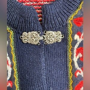 Beautiful vintage nordic clasp chunky sweater from A.S Evebofoss Sandane, Norway. Made from pure new wool with a chunky-knit design, this multicolored sweater features a crew neck and long sleeves. Great for layering! The sweater includes crochet, button, and embroidered accents, adding to its vintage charm. With its clasp front and raglan sleeves, this sweater is both functional and fashionable, representing a blend of classic and contemporary styles. Perfect for the colder seasons, this sweater is a versatile and timeless piece for any wardrobe.