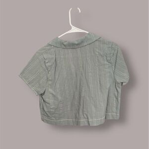 Stylish cropped light gray button-down with subtle stripes. Short sleeves and classic collar. Perfect for casual wear.