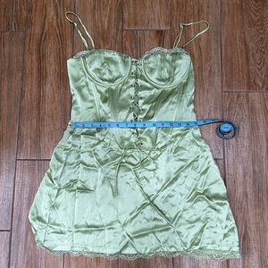 Elegant satin mini dress. Features lace-up front. Spaghetti straps for a chic look.