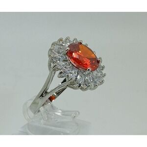 Orange Oval Sunburst Cocktail Ring Silver Tone Split Shank Statement Size 6.5