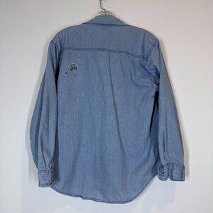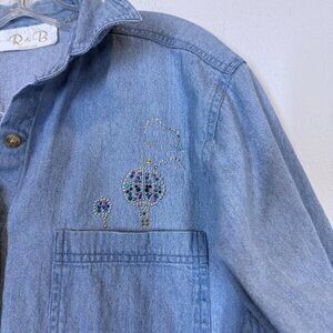 Unique and whimsical, this denim shirt features stunning rhinestone hot air balloon embellishments for a standout vintage western look. Light wash button-down design with a single chest pocket, pointed collar, and relaxed fit. Size Medium.