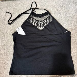 Stylish black crop top. Features lace detailing. Halter neck design. Perfect for casual outings.