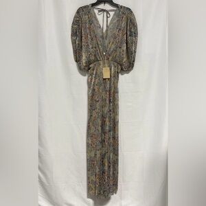 NOT NEGOTIABLE .Step out in style with this elegant floral maxi dress. Perfect for any occasion, this dress features a beautiful blend of colors that add a touch of sophistication to your wardrobe. NOTE model is wearing same style different floral print, the Holly & Joey "Tresor" Maxi Dress. It is characterized by a bohemian-style floral pattern, often with lurex threads for a metallic sheen, featuring a deep V-neckline and voluminous lantern or puff sleeves.