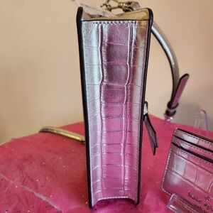 Kate Spade New York Knott Croc Embossed Mini Flap Crossbody 4 pc set NWT. This is a beautiful silver crossbody with embossed Kate spade emblem on the front. The measurements are approximately L 7 X H 5. The bag alone retails $279, the wallet NWOT retails $89. The total retail is $368. The bag has an exterior pocket, interior zip pocket. snap closure, fits most phones. You get the bag, silver card holder, the silver cherries and the Kate spade dust bag. While I have listed the price, I am open to reasonable offers. All sales are final, no cancellations and no returns. I appreciate your visit my closet, I hope you have an amazing shopping day!