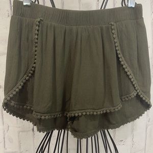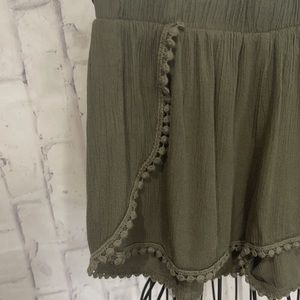 Ambiance Boho Festival Shorts Pompom Trim Olive Green Gauzy Rayon Overlapping