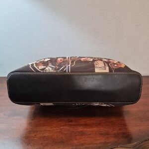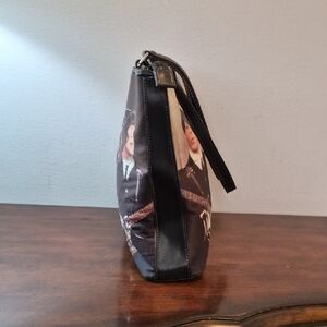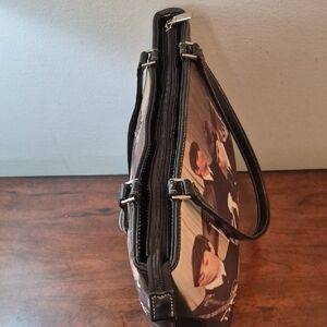 Chic tote bag featuring a vibrant Beatles band print. The front side has bling on it. Ideal for music enthusiasts. The bag has a zippered closure and made with fabric.
